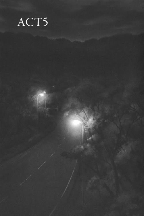 Saber mở tung cửa xe và bước vào khung cảnh giữa màn đêm lạnh lẽo. Gió đêm xào xạc mơn man trên những ngọn cây. Không khí hoà lẫn mùi khét của lốp xe cháy vì ma sát.