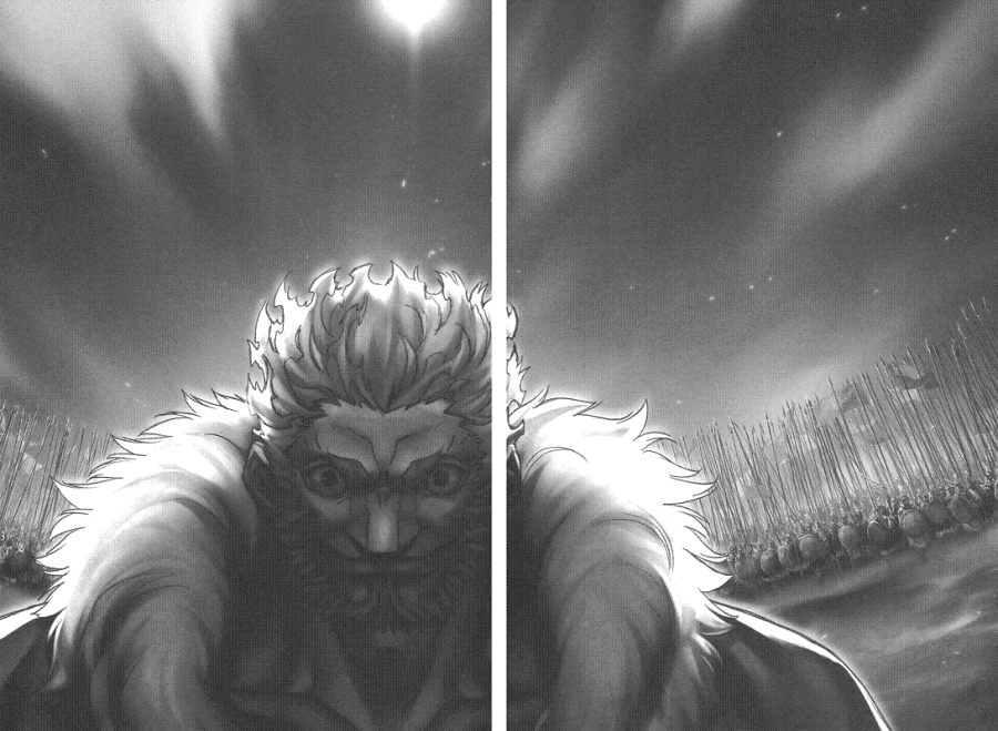 Giọng Saber đã chất chứa đầy sự tức giận, nhưng Alexander chỉ nhìn cô với vẻ thương hại. Ông tuốt gươm khỏi vỏ rồi vung lên. Bất ngờ, một tiếng sấm rền vang, và cỗ xe thắng những con bò thần xuất hiện. Không ấn tượng như Ionian Hetaroi, nhưng vẫn là một sự việc đáng chiêm ngưỡng.