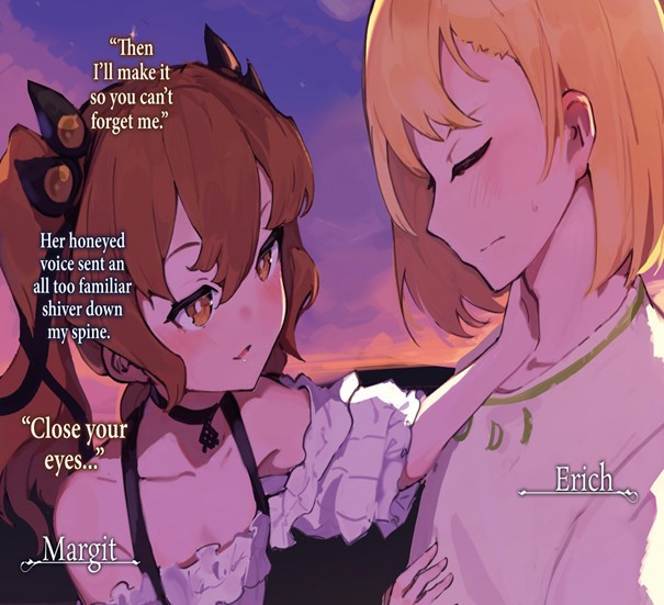 “Thật sao? Chà… giống cậu lắm.” Margit nói một cách tự nhiên bằng giọng thường dân. Ánh mắt cô ấy không bao giờ rời khỏi tôi, nhưng vẻ mặt cứng rắn của cô ấy đột nhiên nhớ lại cảm giác có màu khi cô ấy cười. “Được, tớ sẽ tin tưởng cậu. Ngoài kia không có cô gái nào tốt bụng như tớ đâu đó?”