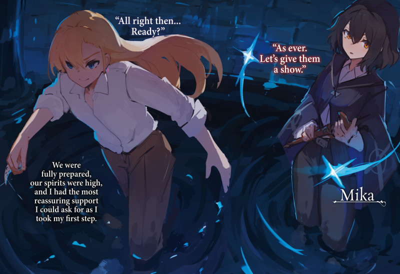 Mika dẫn đầu đội hình, với cô Cecilia ở giữa, và tôi ở phía sau. Với hai người chúng tôi soi đường bằng phép thuật, chúng tôi có thể tạo đủ để tiến lên mà không sợ bị trượt chân.