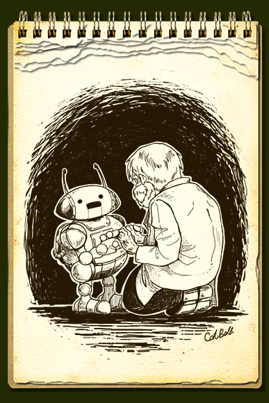 Với đôi bàn tay lạnh giá, cứng ngắc và cơ học của mình, chú robot nắm lấy bàn tay dính đầy dầu nhớt của vị giáo sư, và nói thế này."Sớm thôi, ngài sẽ bước đi trên một cuộc hành trình mới. Bỏ lại tôi phía sau, ngài sẽ trở nên cô đơn. Một thế giới nơi ngài đã ra đi, tôi tự hỏi, có được một trái tim để làm gì?