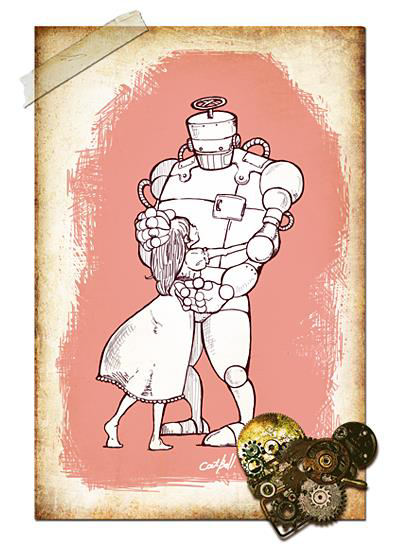 Một chú robot đang bế một cô gái trên bàn tay bằng sắt của mình.